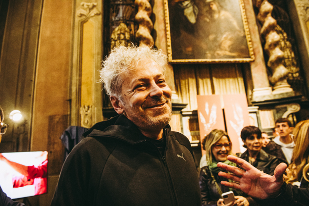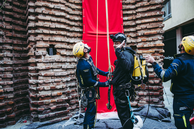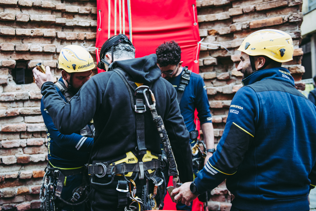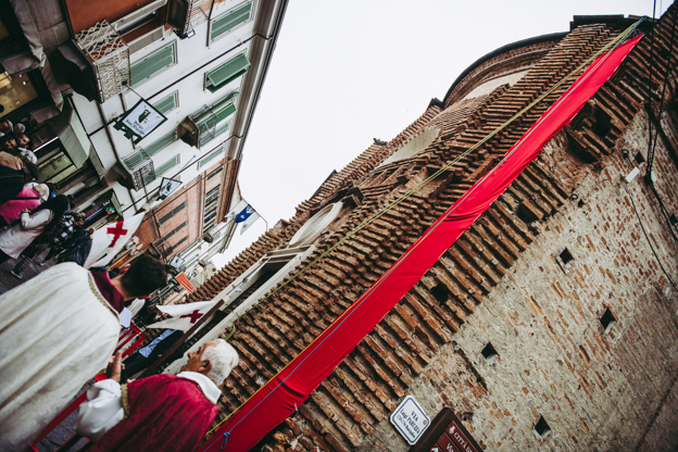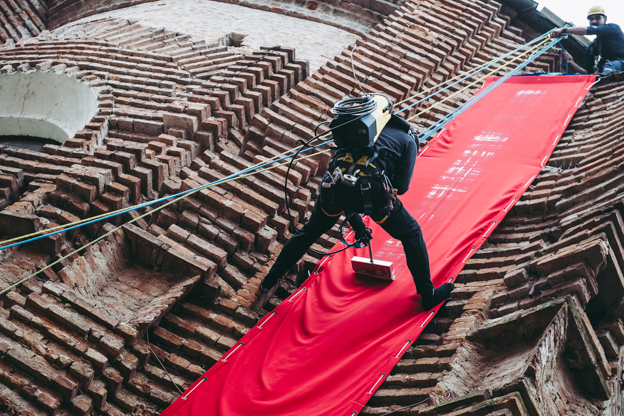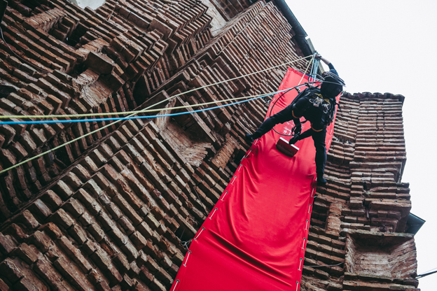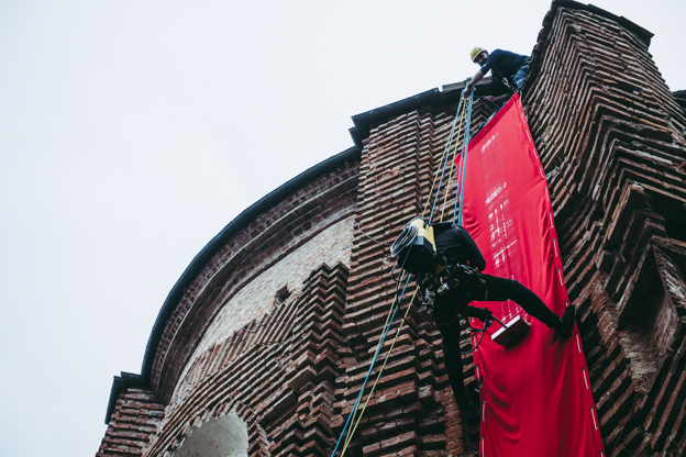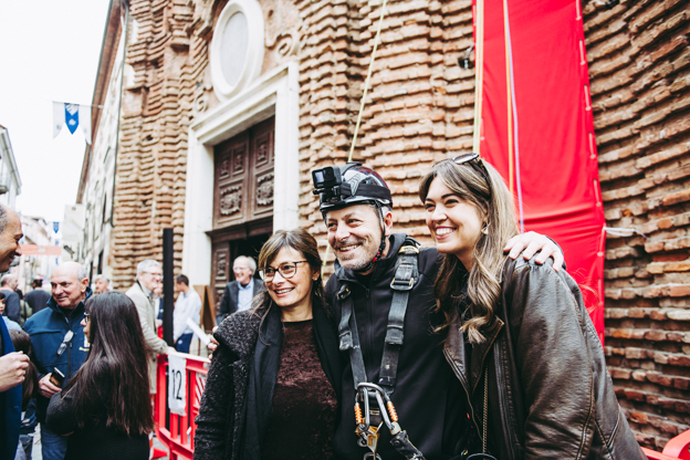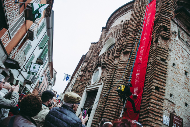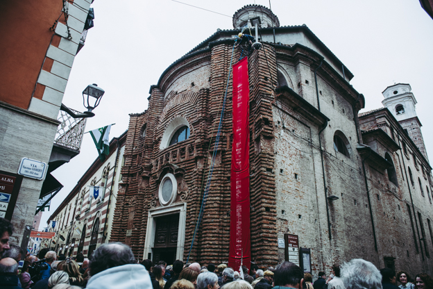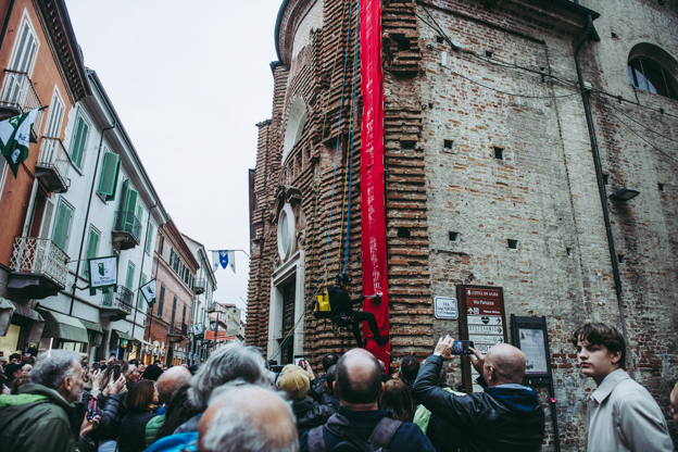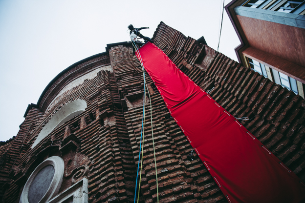 The Time Identity, la sua linea di colore su un telo rosso, questa volta ha colto la traccia di uno dei monumenti simbolo di Alba. Affiancato dagli esperti scalatori di Edilizia Acrobatica, è salito fino alla sommità della chiesa, per poi scendere, accompagnato dalla musica di Piero Ponzo.