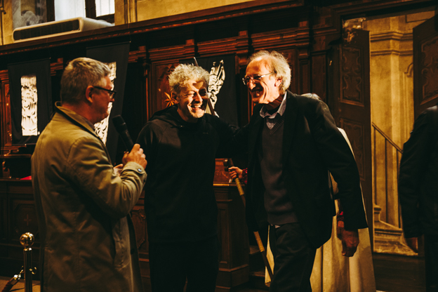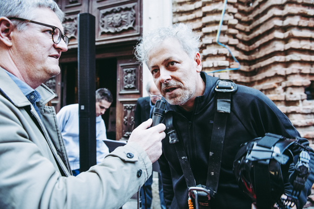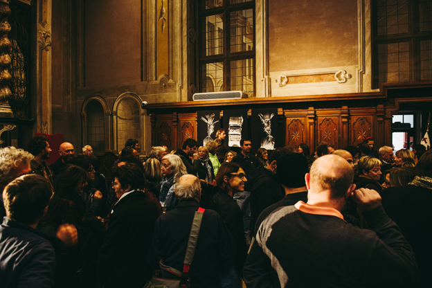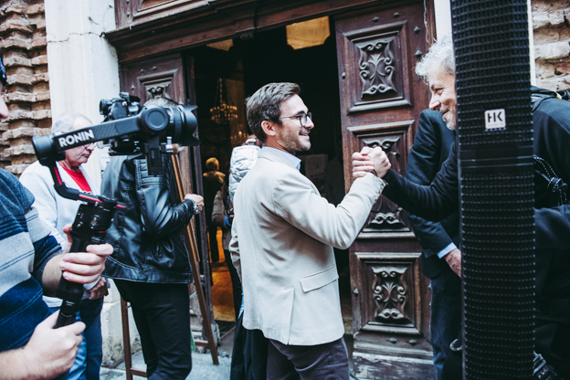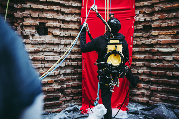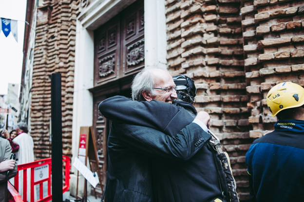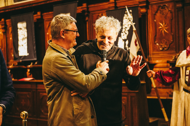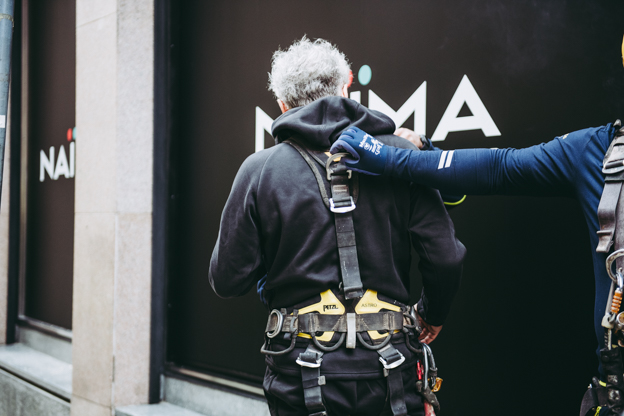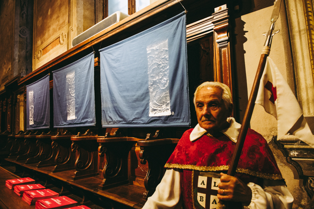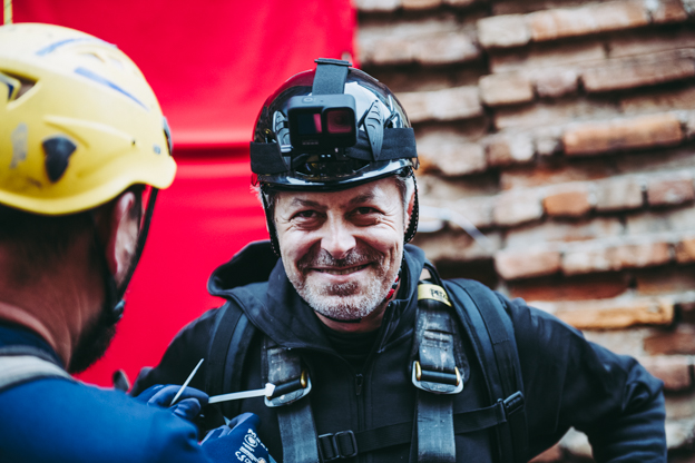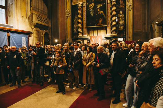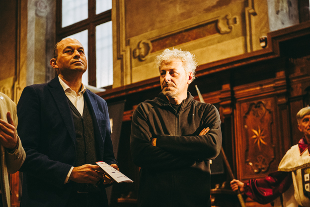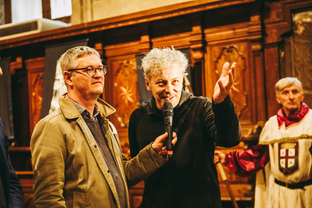 The Time Identity, la sua linea di colore su un telo rosso, questa volta ha colto la traccia di uno dei monumenti simbolo di Alba. Affiancato dagli esperti scalatori di Edilizia Acrobatica, è salito fino alla sommità della chiesa, per poi scendere, accompagnato dalla musica di Piero Ponzo.