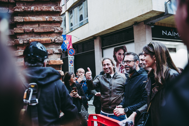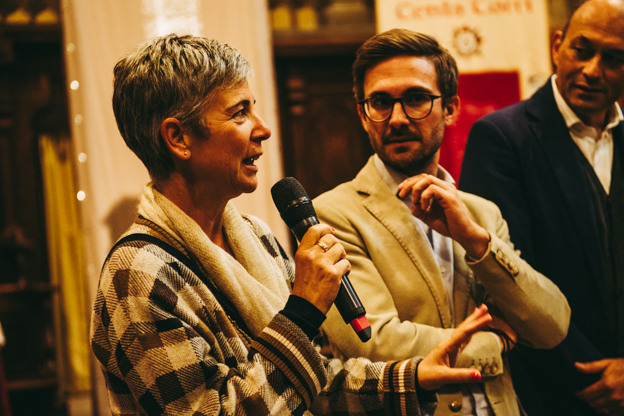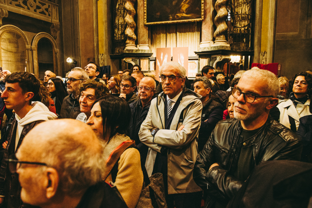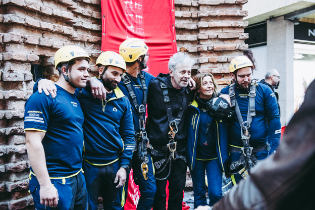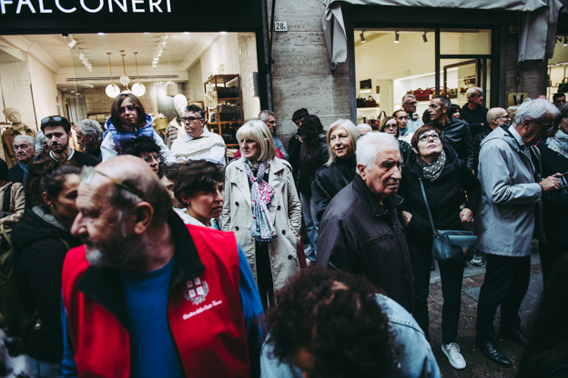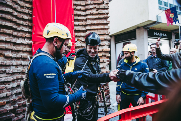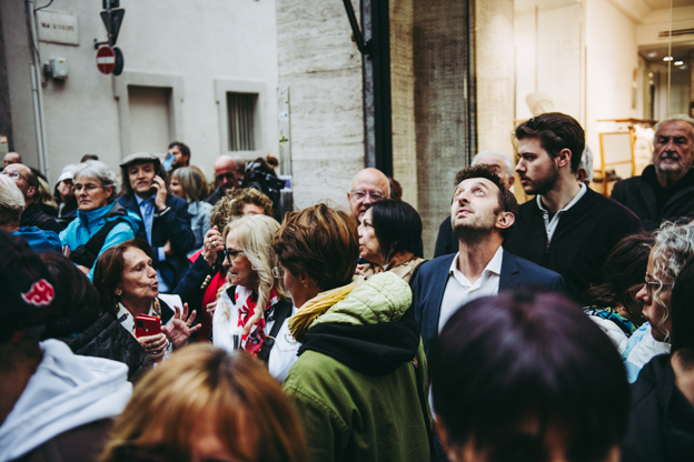 ALBA – «Questa linea racchiude un messaggio contro le guerre. Perché tutti i popoli del mondo dovrebbero avere il diritto di fare arte in libertà, come noi questa sera»: con queste parole Enzo Mastrangelo, artista e architetto albese, ha salutato le tante persone presenti in via Vittorio Emanuele, con il naso all’insù, per assistere alla sua discesa dalla chiesa della Maddalena.