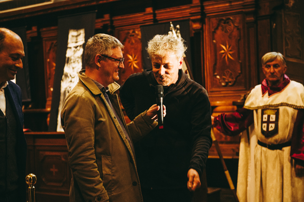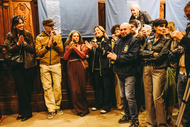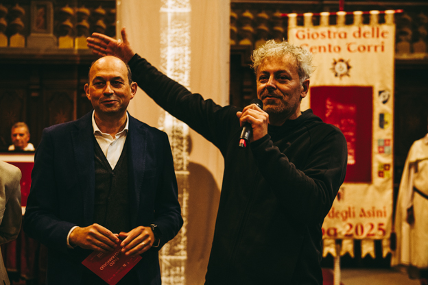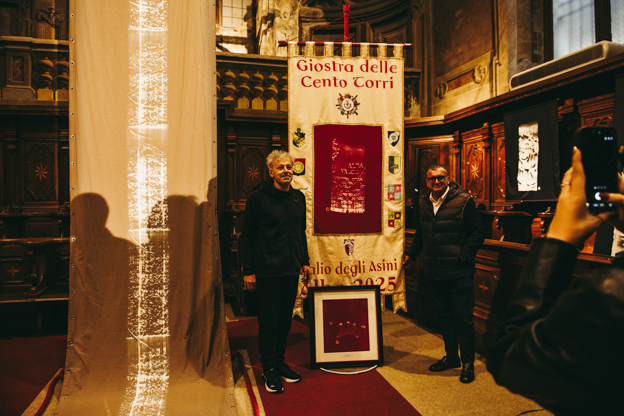 La performance è stata organizzata dalla Giostra delle Cento Torri (presieduta da Luca Sensibile), in collaborazione con il Comune e l’Ente Fiera. Mastrangelo è infatti l’artista del Palio 2025: il suo drappo andrà oggi, 5 ottobre, al borgo vincitore della corsa.
