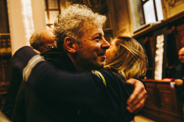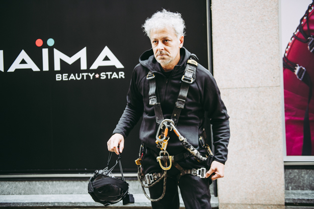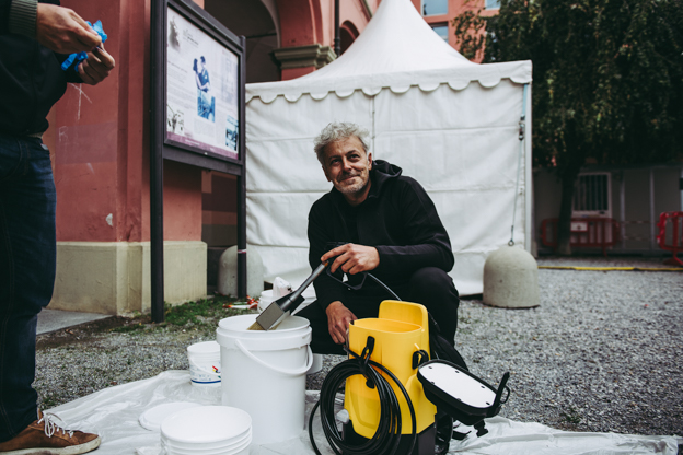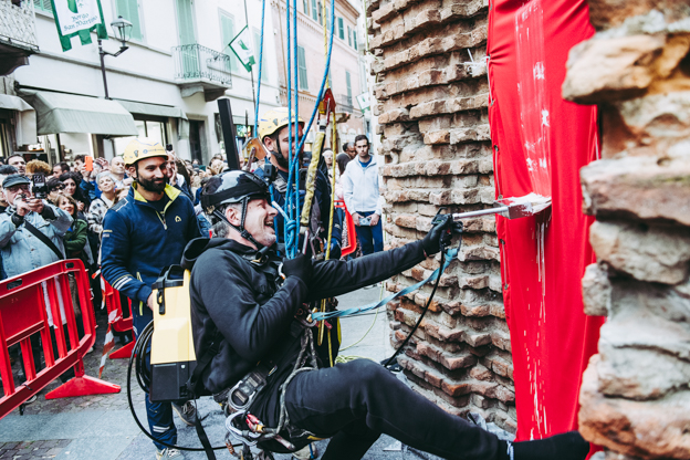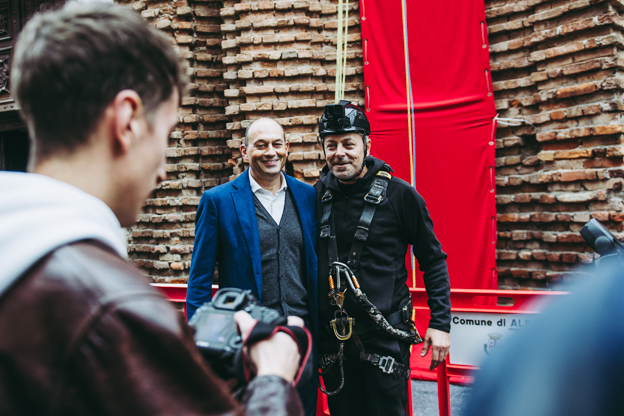 Nelle prossime settimane l’artista eseguirà una seconda performance, questa volta sulla torre Sineo, in piazza Risorgimento.