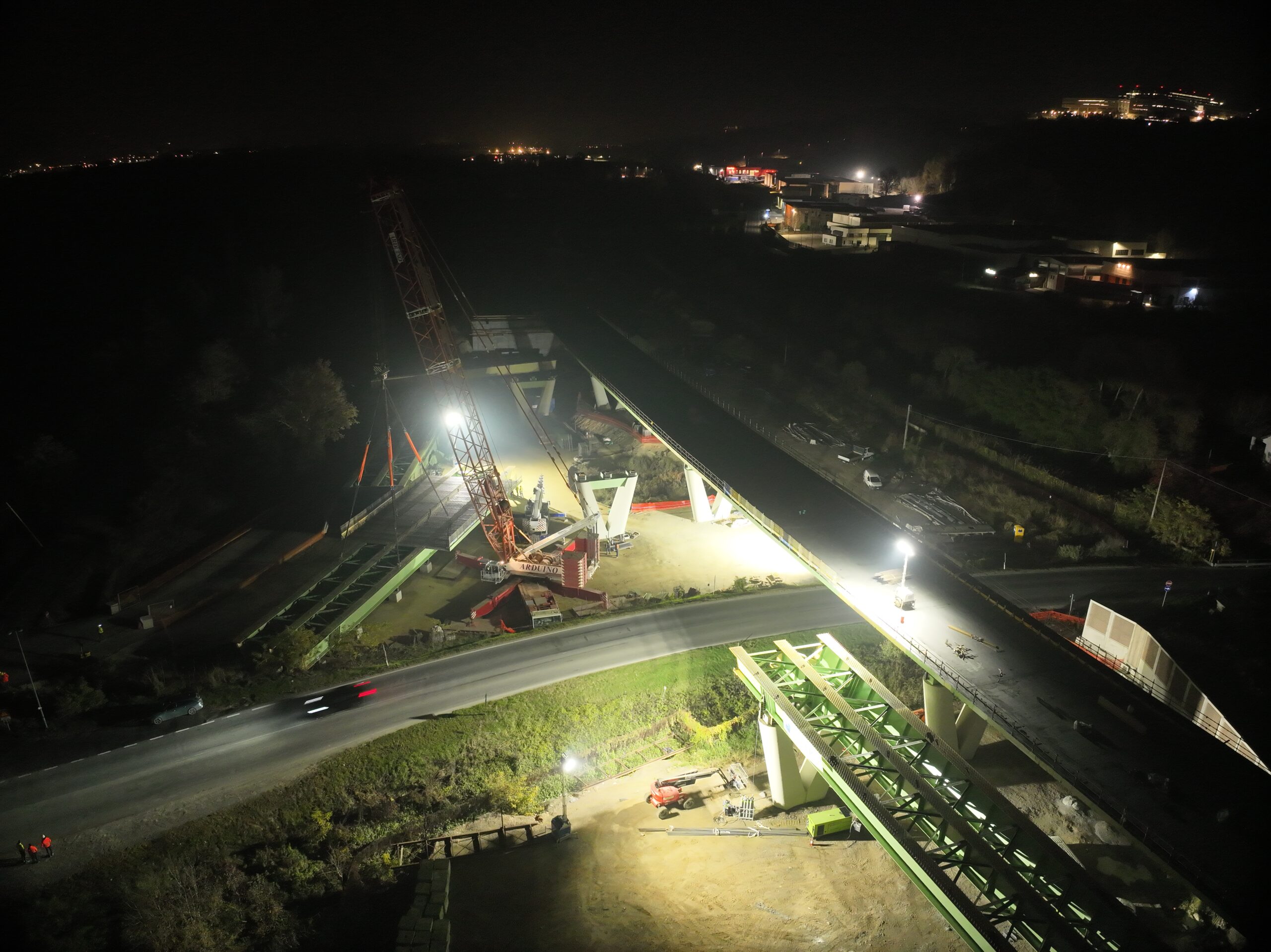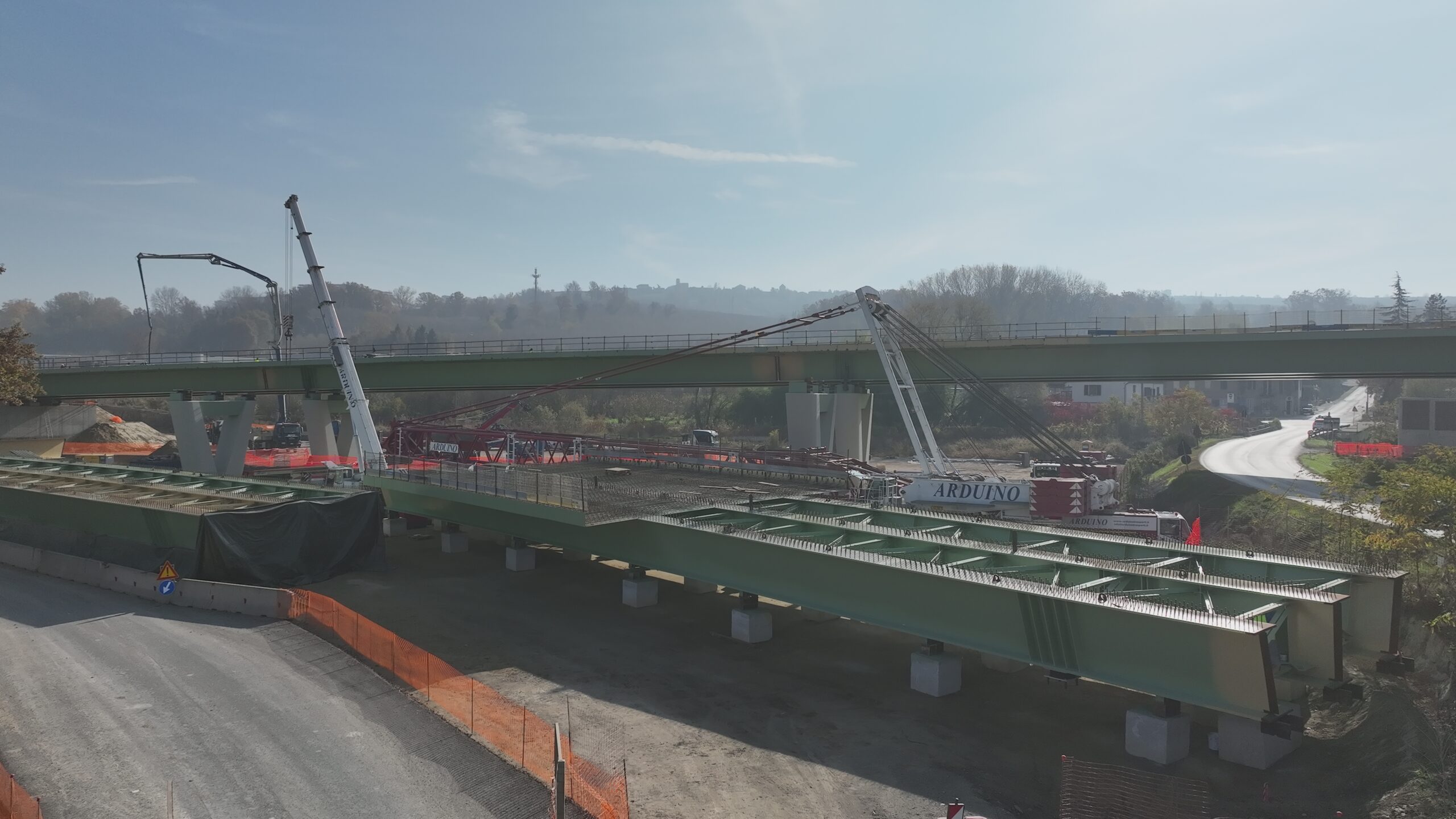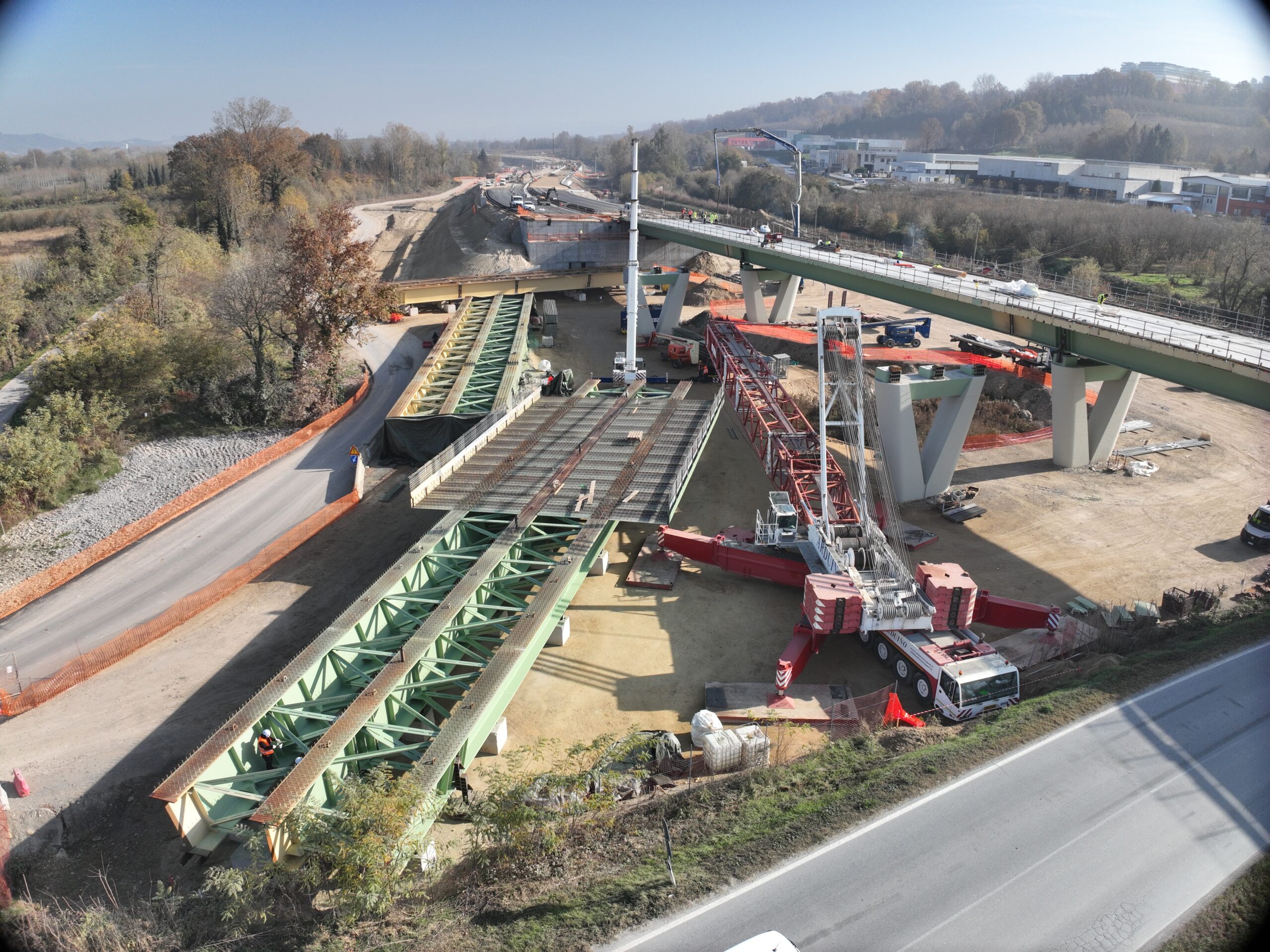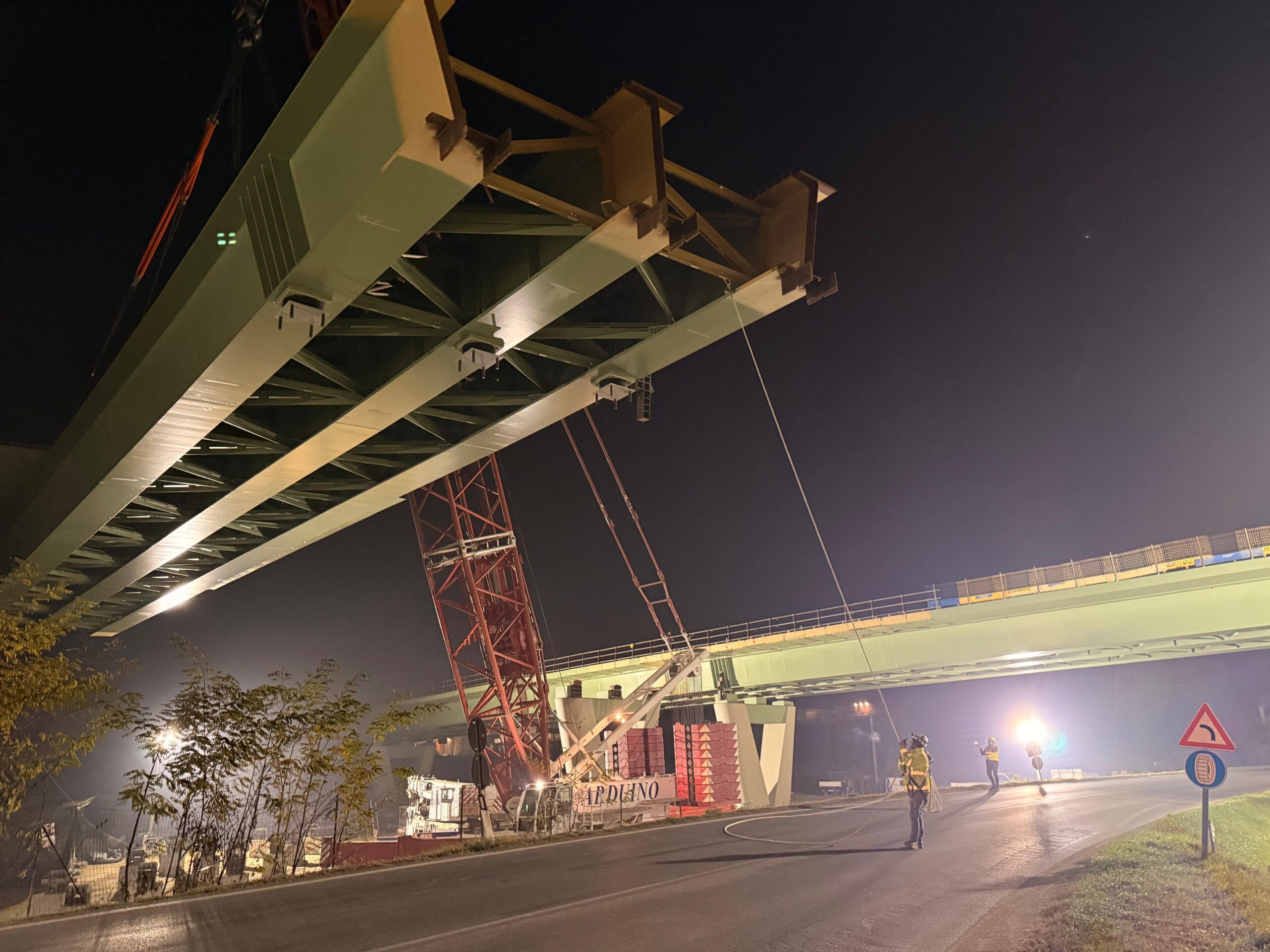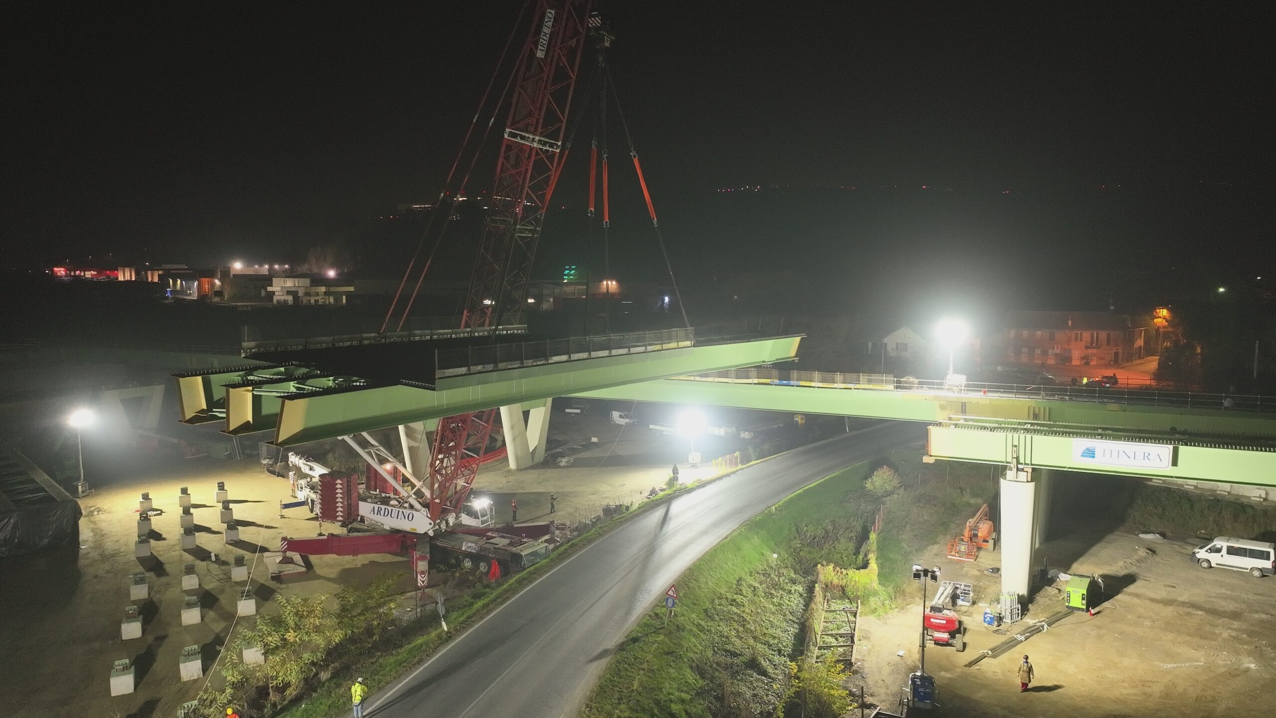 A33 – Nella notte tra il 10 e l’11 novembre è stato varato il secondo impalcato metallico del Viadotto SP7 ( Autostrada A33 ) in località Verduno in direzione Cuneo. Con una luce di 50,10 metri e un peso complessivo di circa 220 tonnellate, l’impalcato preassemblato a terra è stato sollevato da una gru da 800 tonnellate e posizionato mediante una lenta rotazione in quota. Come per il primo varo, l’elemento è stato installato con le predalles metalliche già montate, al fine di ridurre al minimo le interferenze con la viabilità nelle successive fasi di completamento.