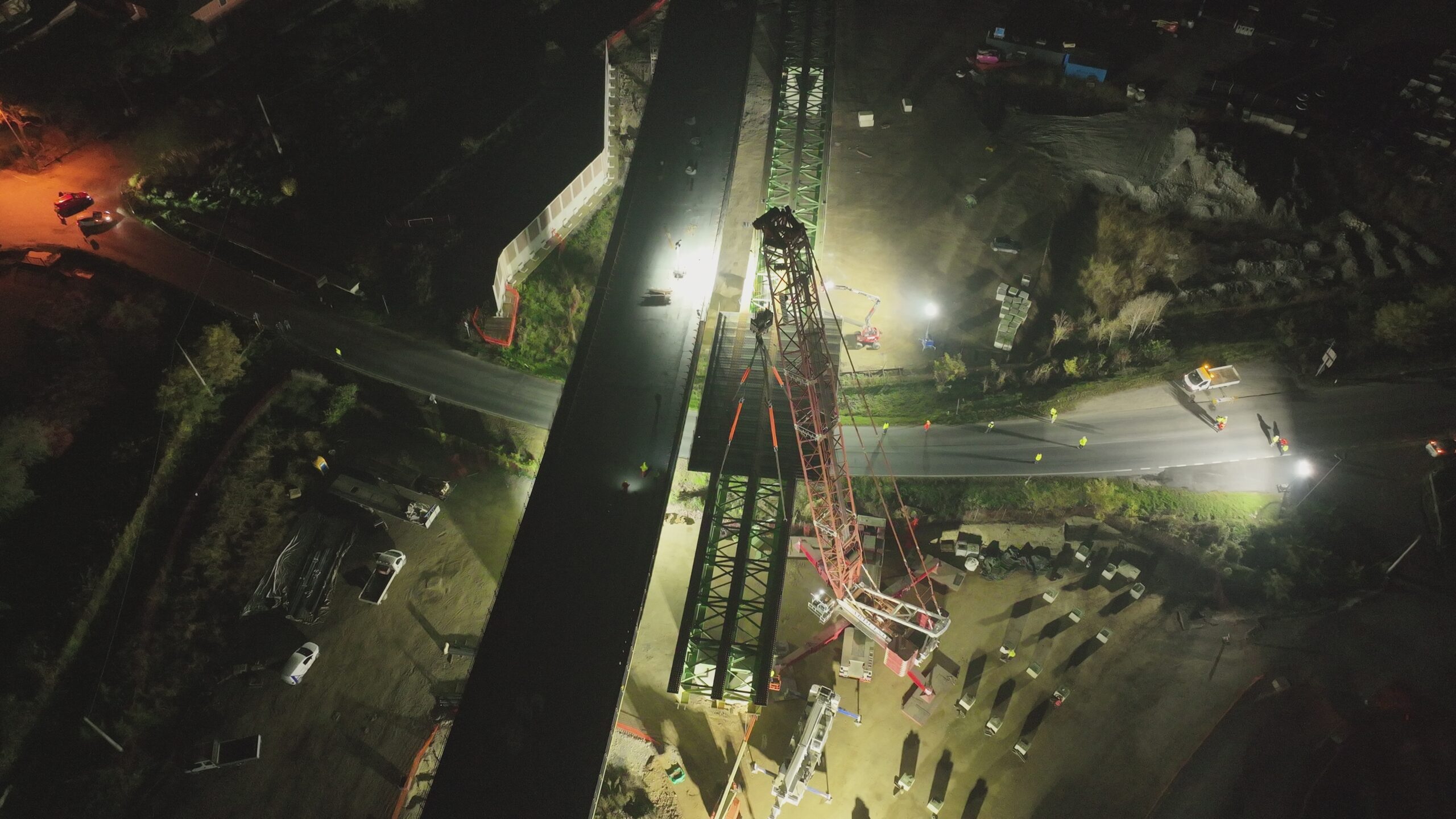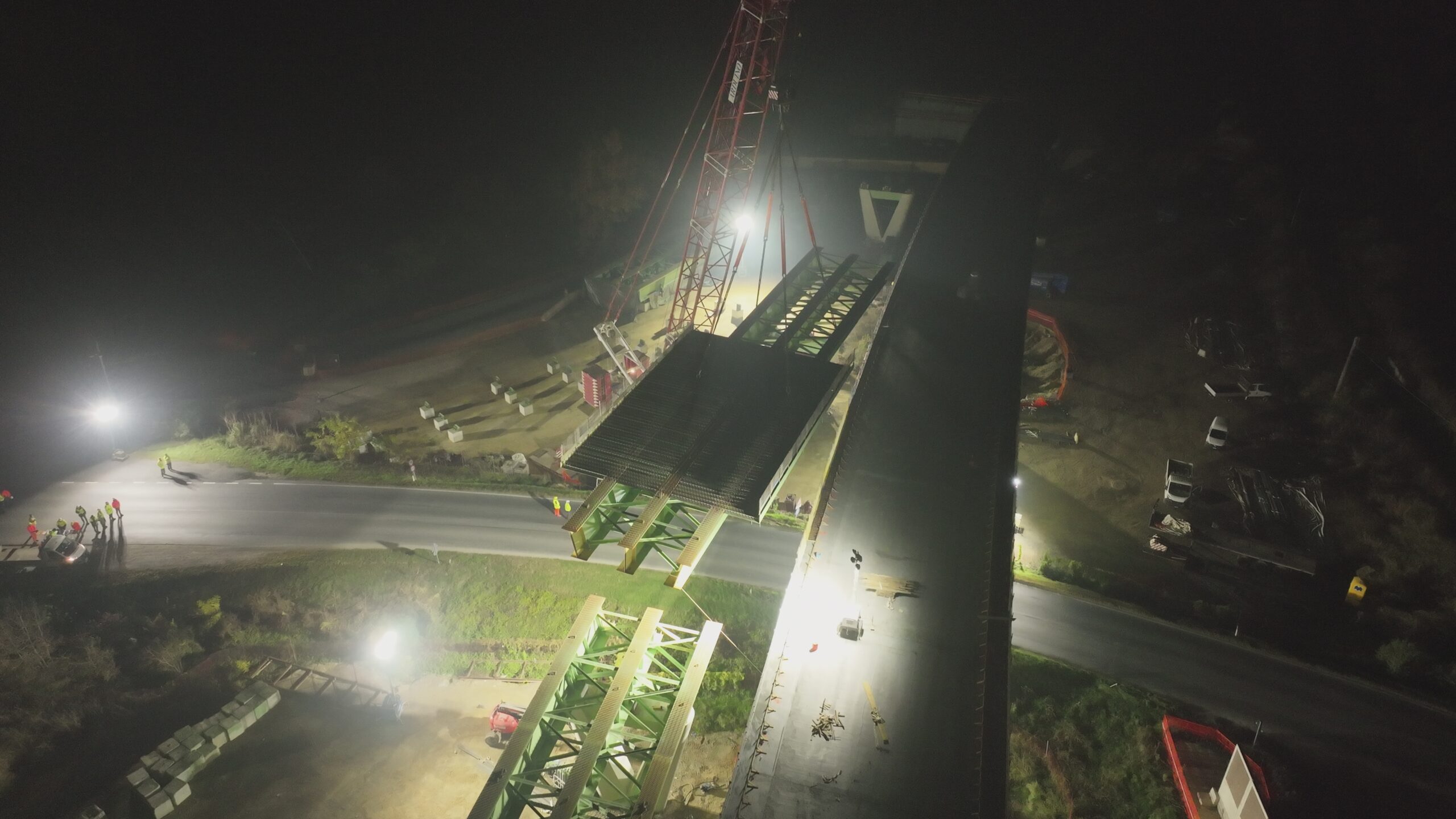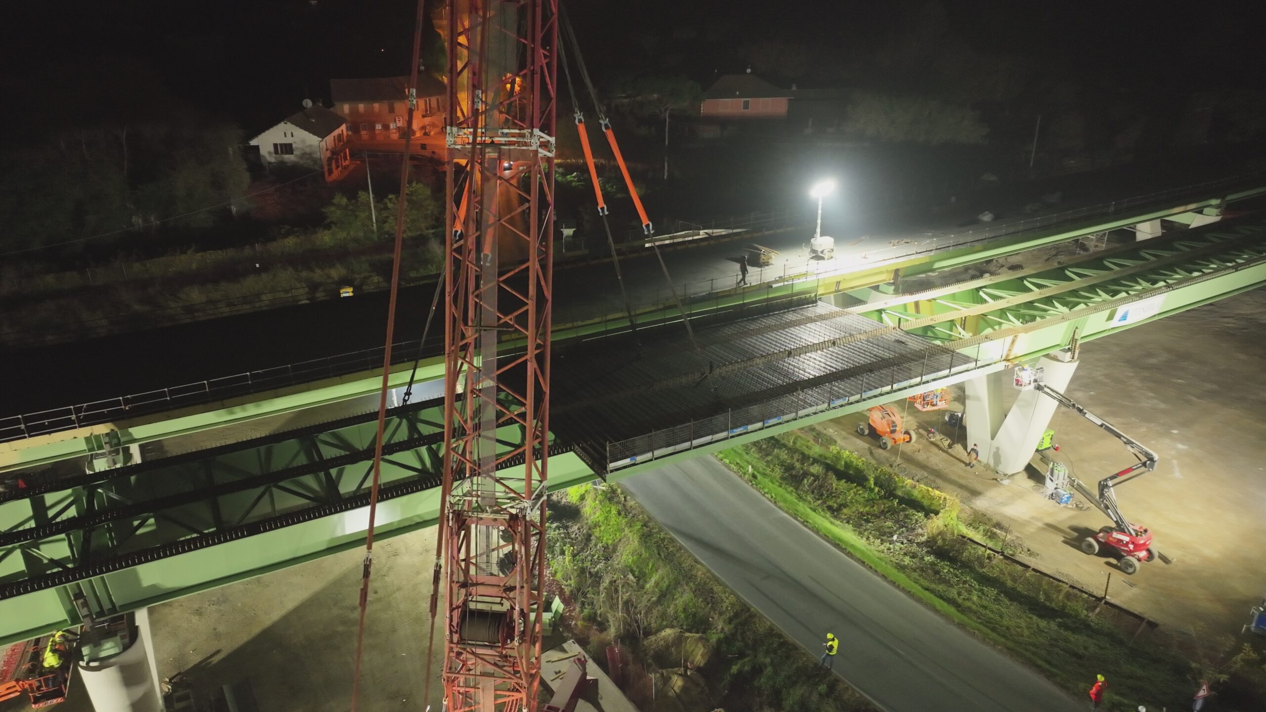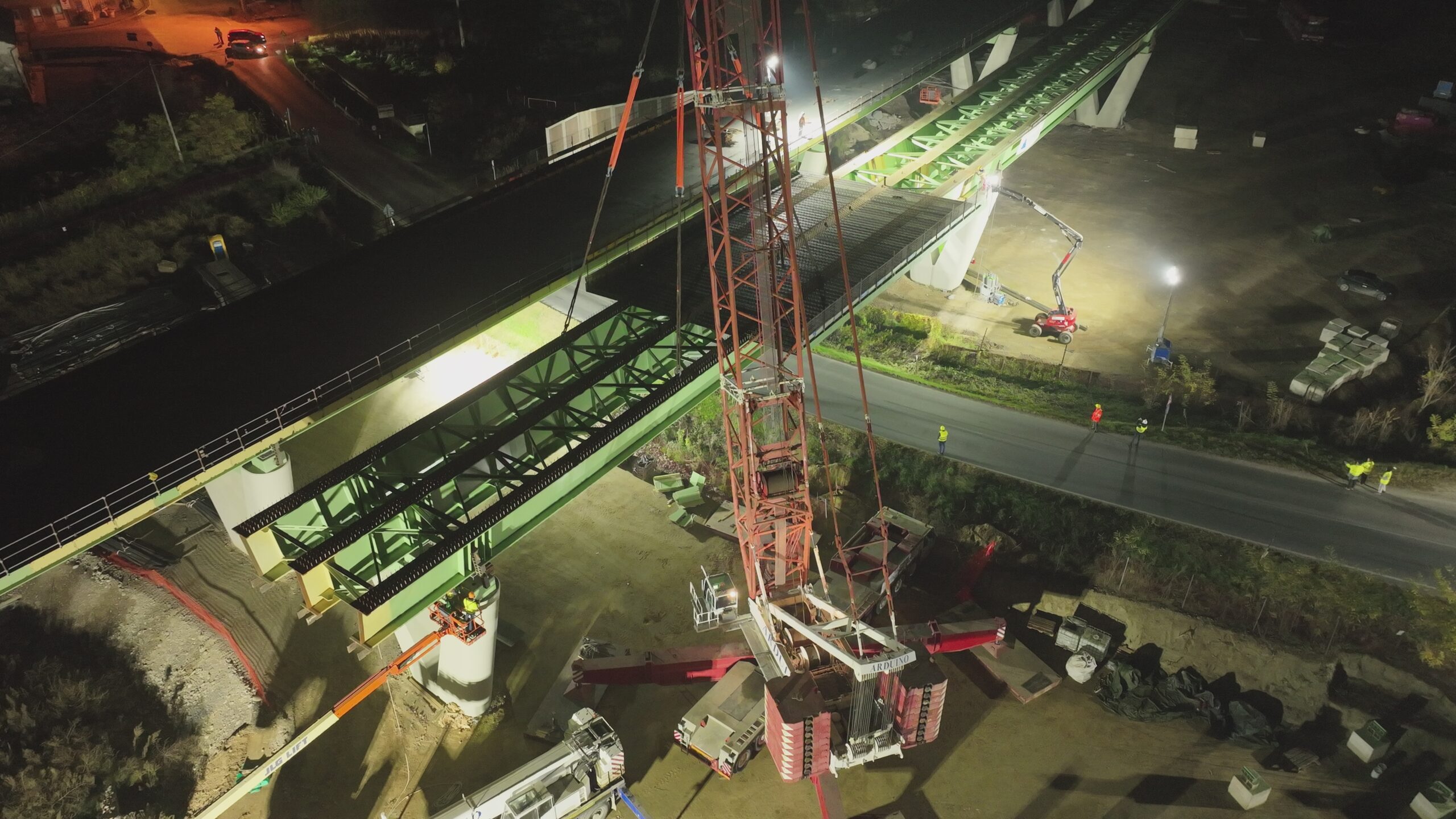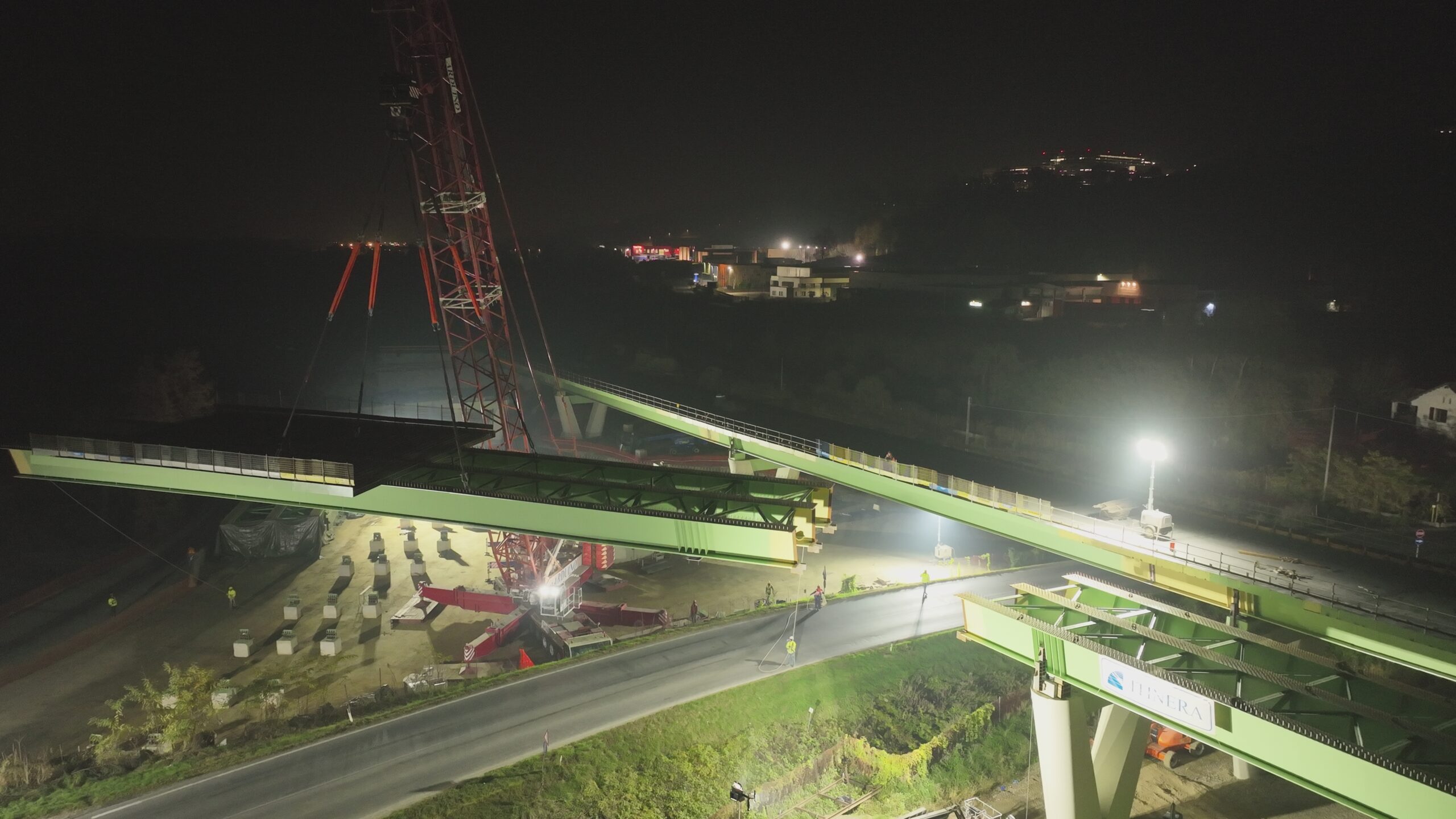 A33 – Nella notte tra il 10 e l’11 novembre è stato varato il secondo impalcato metallico del Viadotto SP7 ( Autostrada A33 ) in località Verduno in direzione Cuneo. Con una luce di 50,10 metri e un peso complessivo di circa 220 tonnellate, l’impalcato preassemblato a terra è stato sollevato da una gru da 800 tonnellate e posizionato mediante una lenta rotazione in quota. Come per il primo varo, l’elemento è stato installato con le predalles metalliche già montate, al fine di ridurre al minimo le interferenze con la viabilità nelle successive fasi di completamento.