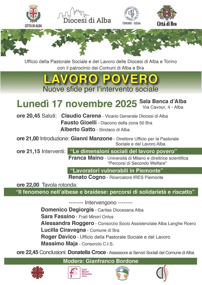 Seguirà una tavola rotonda aperta al pubblico dedicata alla situazione del territorio albese e braidese, introdotta dagli interventi di don Domenico Degiorgis, direttore della Caritas cittadina, e di fra Mauro Battaglino, dei Frati minori Onlus. Non mancheranno testimonianze e contributi dal pubblico.