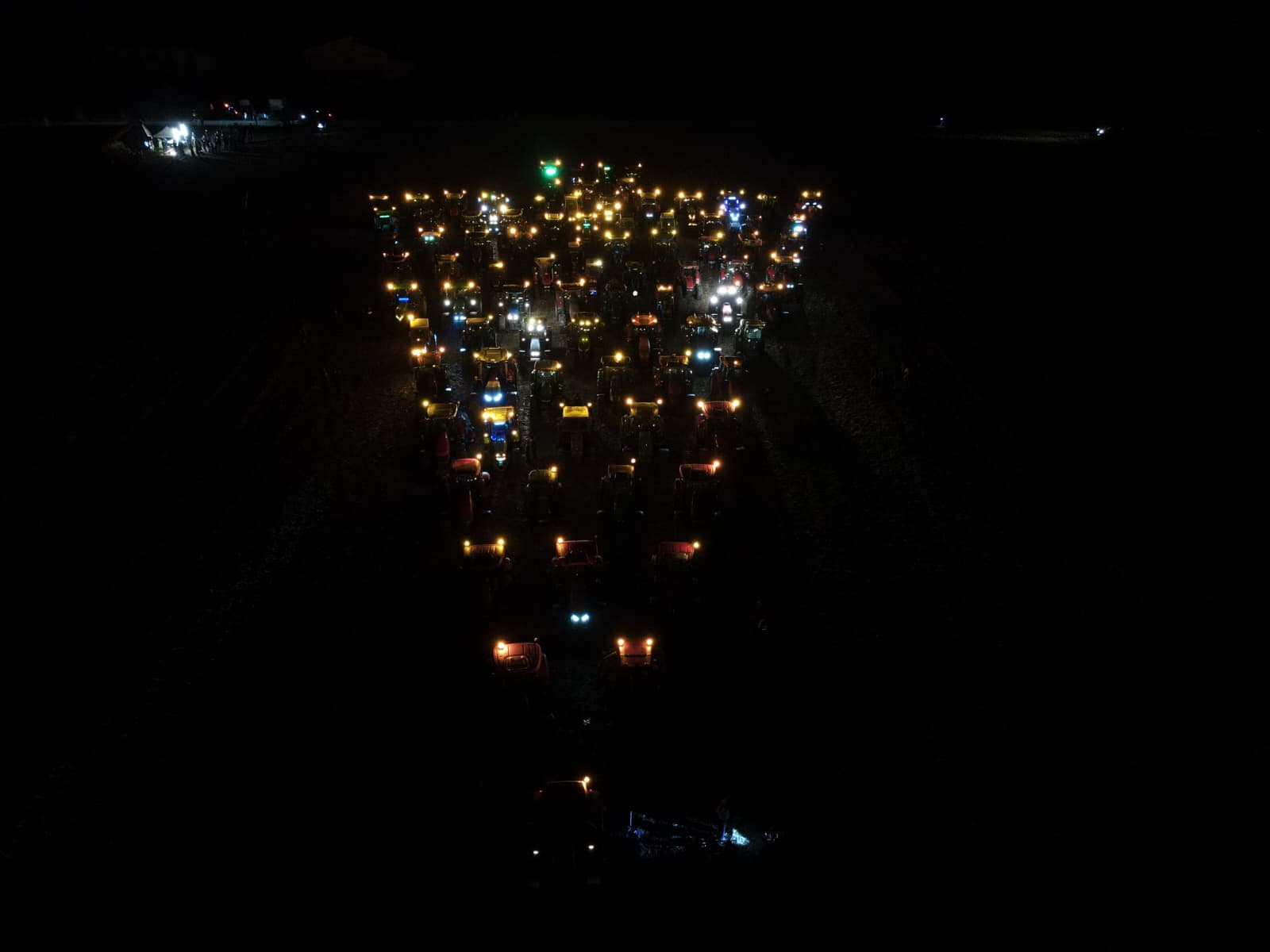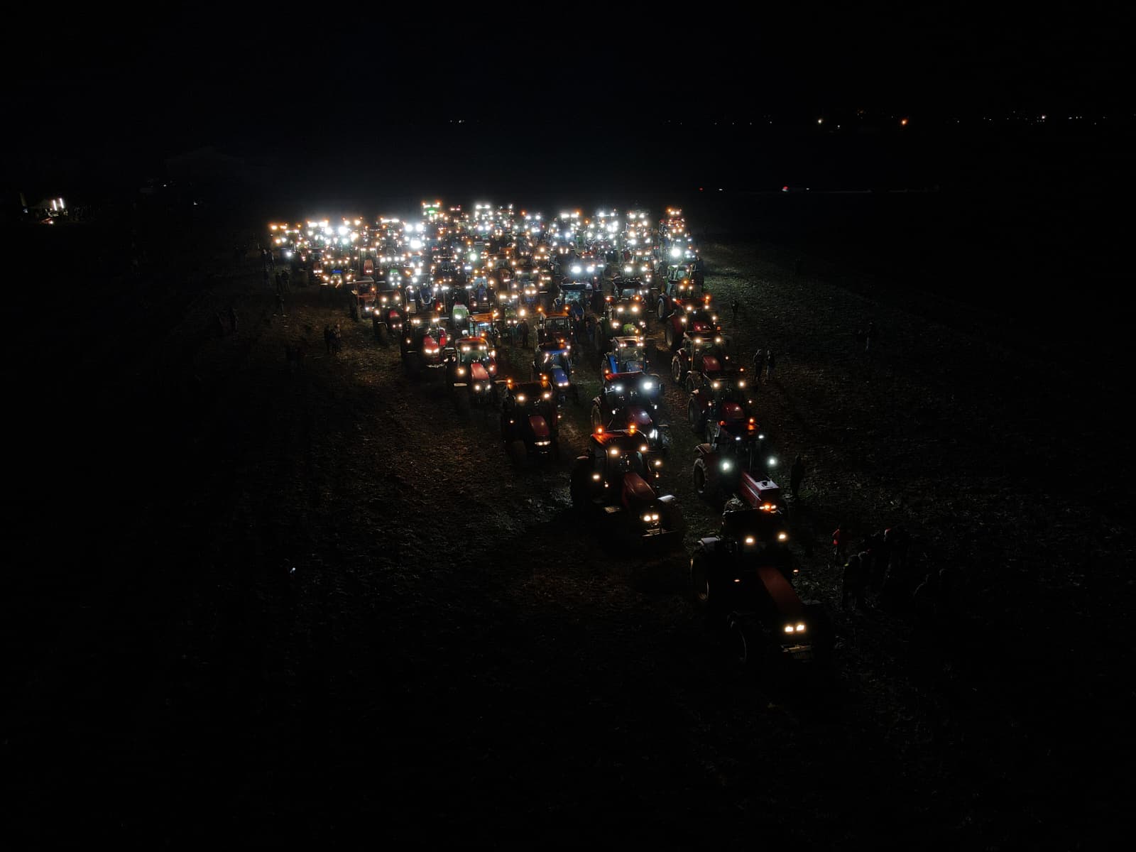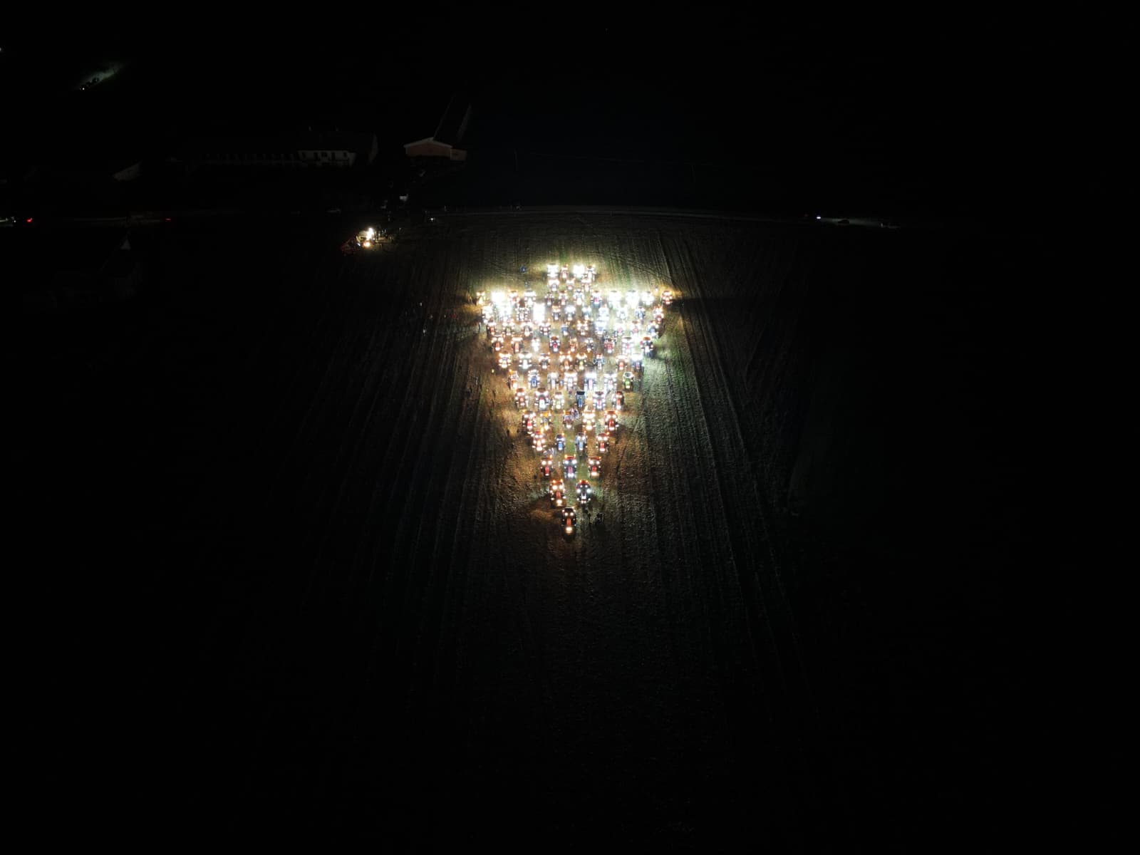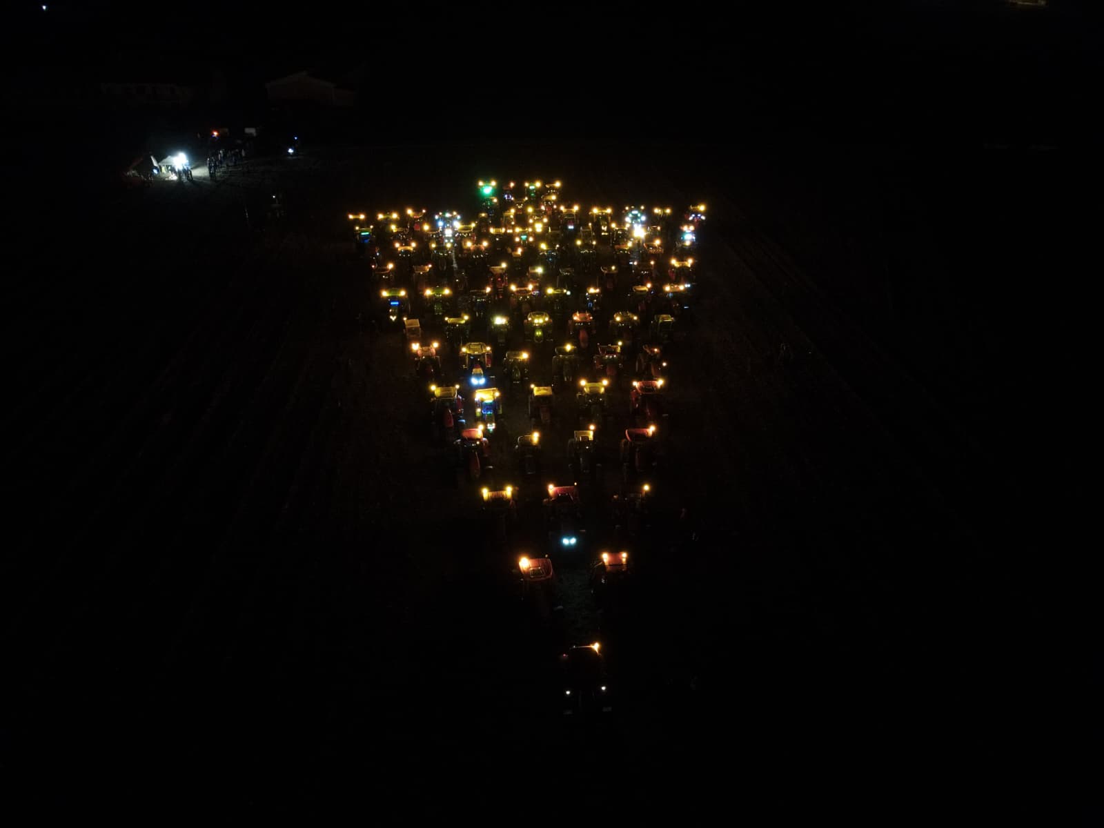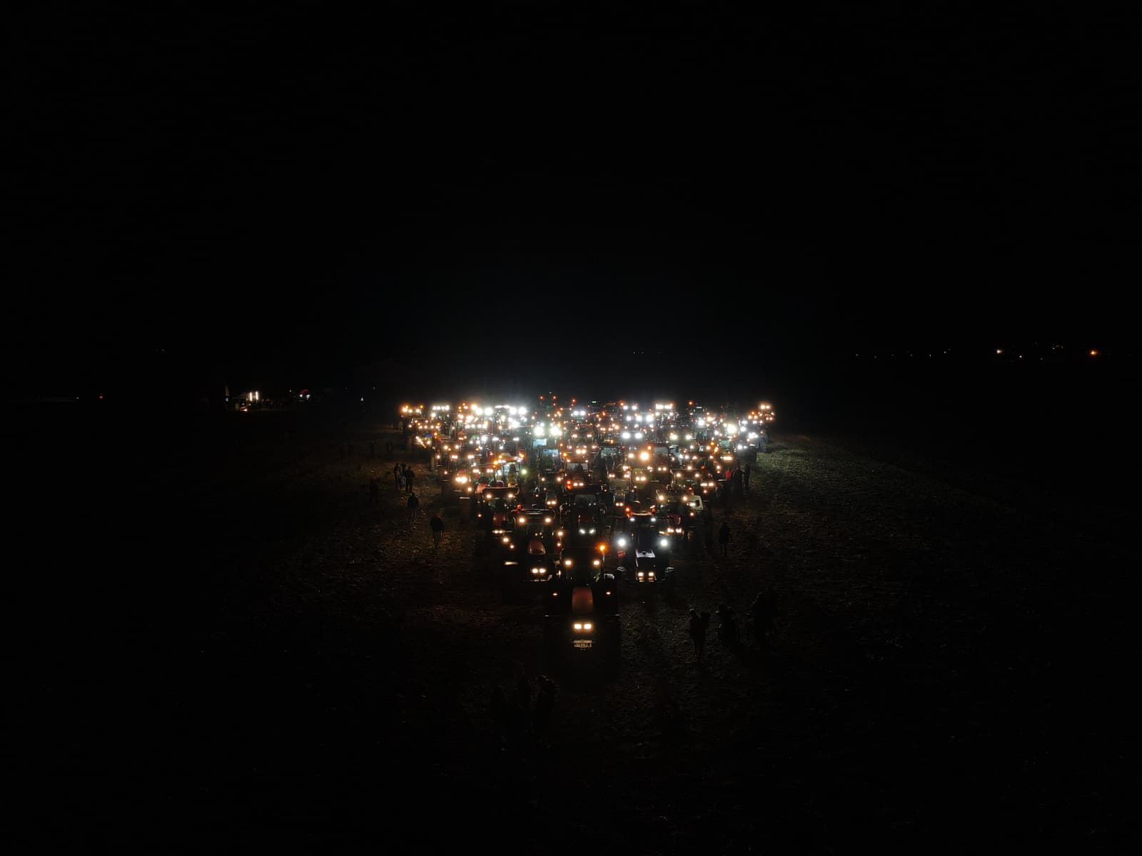 Con il favore delle tenebre, i trattori accuratamente disposti seguendo un disegno predisposto dagli organizzatori hanno acceso i loro potenti fari, creando un effetto luminoso davvero suggestivo.