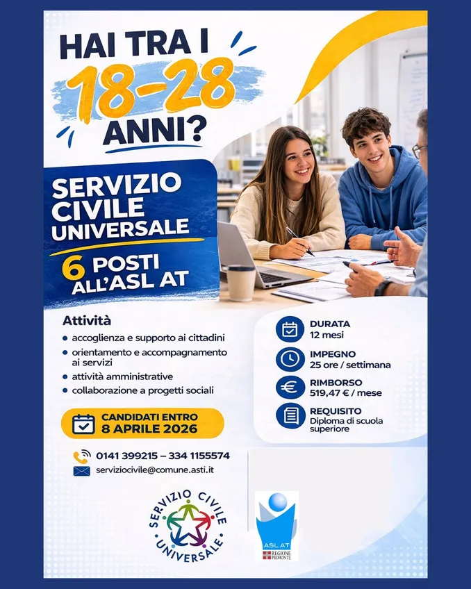 I volontari, che operano presso l’Asl astigiana, saranno inseriti all’interno delle strutture del servizio sociale aziendale, di neuropsichiatria infantile, di psicologia e degli affari generali. Nello specifico, i compiti prevalenti saranno di accoglienza dell’utenza, orientamento e accompagnamento, tenuta documentale, partecipazione e collaborazione a progetti. L’iniziativa ha la durata di dodici mesi e prevede un orario di servizio di 25 ore settimanali, da lunedì a venerdì. È previsto un rimborso forfettario mensile 519,47 euro. Per essere ammessi al colloquio di selezione, è richiesto il possesso del diploma di scuola media superiore (tutti i dettagli sono disponibili sul sito Internet https://www.comune.asti.it/servizi/servizio-civile-universale). La candidatura può essere trasmessa esclusivamente online tramite Spid o carta d’identità elettronica. Si potrà presentare domanda per un solo progetto e per una sola sede entro le 14 di mercoledì 8 aprile. Per ulteriori informazioni, è possibile contattare l’ufficio servizio civile del Comune di Asti ai numeri di telefono 0141-39.92.15 e 334-11.55.574; scrivere un’email all’indirizzo serviziocivile@comune.asti.it; visualizzare le pagine dedicate su Facebook e Instagram Servizio civile Città di Asti e Informagiovani; oppure consultare il sito Internet https://www.politichegiovanili.gov.it/comunicazione/news/2026/2/bando-ordinario-2026/