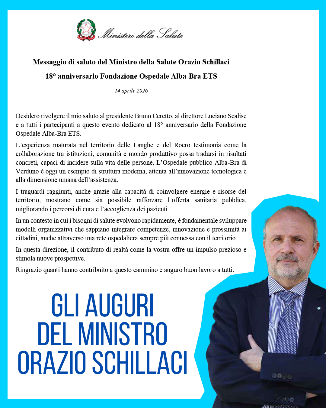VERDUNO – La fondazione Ospedale Alba-Bra, per i suoi 18 anni di attività, ha ricevuto una lettera del ministro della salute Orazio Schillaci, che ha sottolineato quanto la collaborazione tra enti privati e sanità pubblica possano segnare una svolta per affrontare i bisogni assistenziali di oggi.