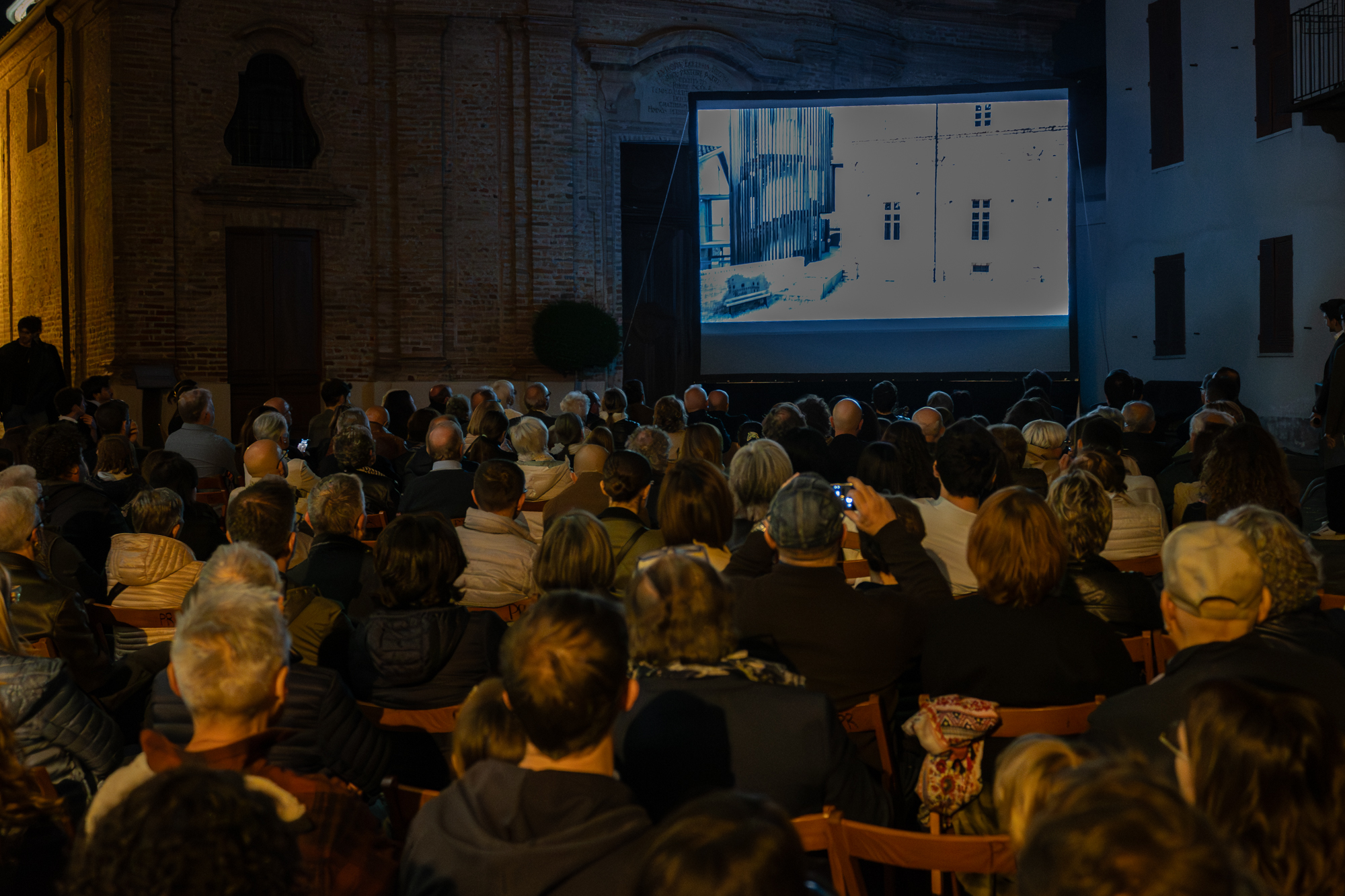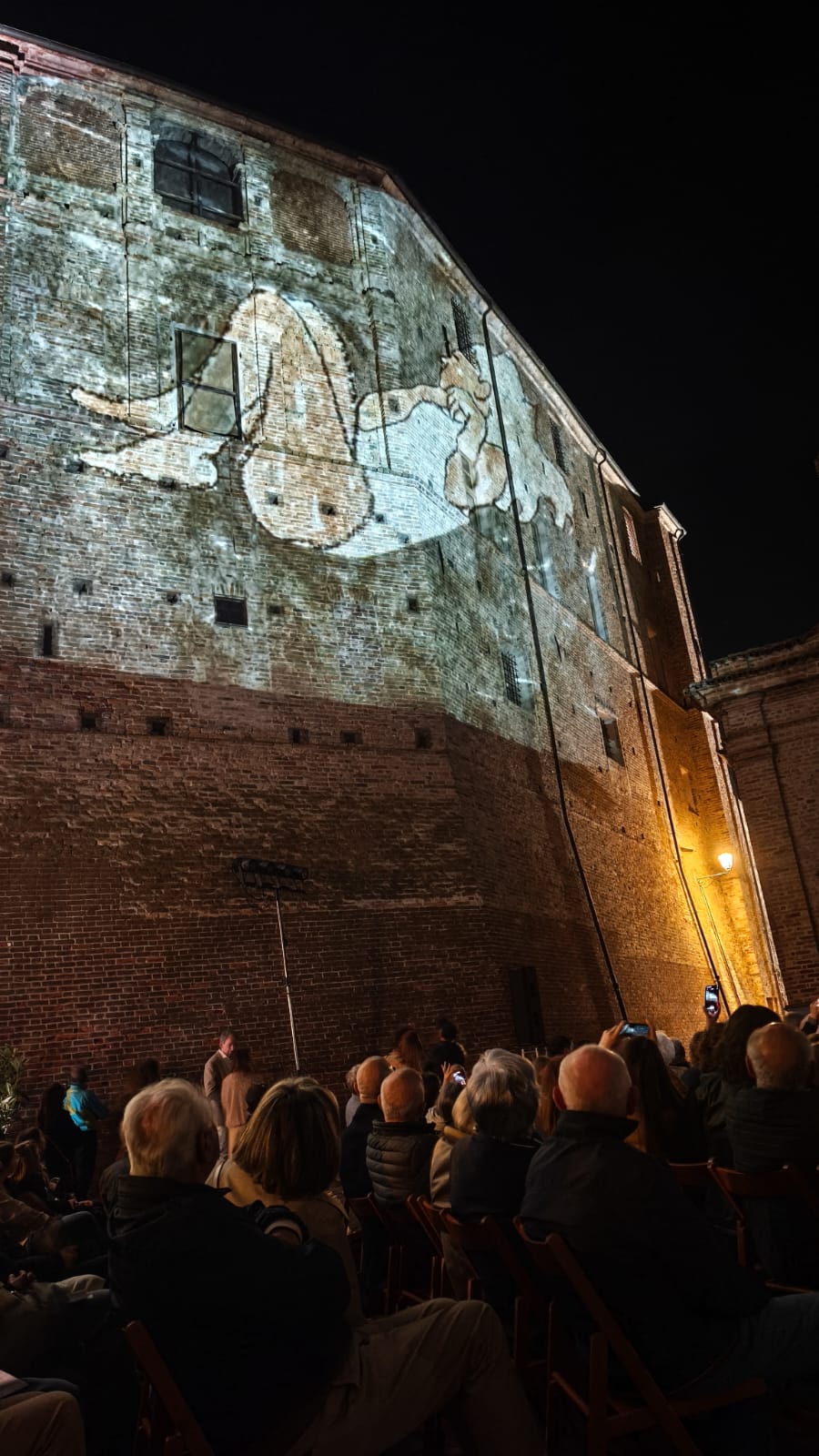 Niente taglio del nastro: l’apertura ufficiale è stata affidata a un gesto simbolico e potente, la proiezione sulla facciata del castello dell’opera animata “Lilith”, cuore del percorso espositivo. Un’immagine visibile anche a distanza, da Alba, dall’autostrada e da diverse località della Langa, capace di trasformare il castello in una vera e propria tela luminosa.
