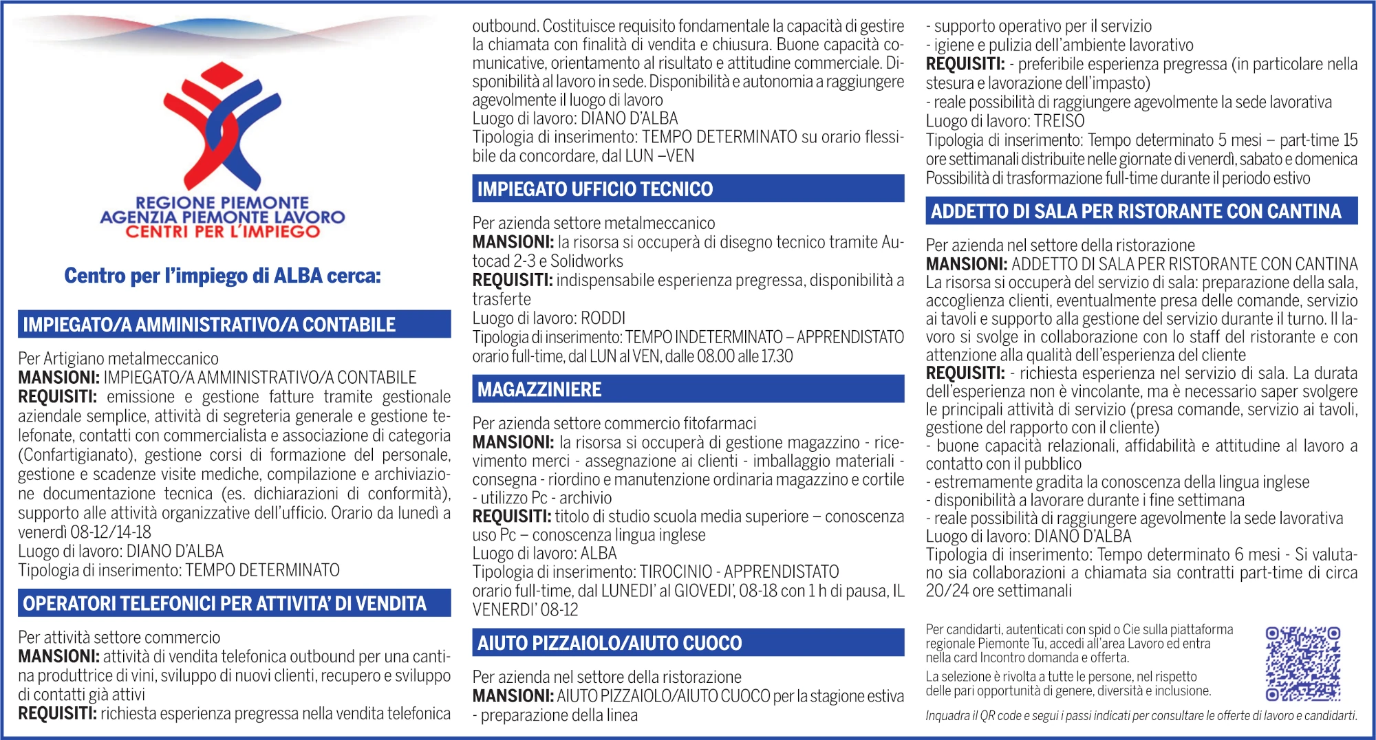Offerte di lavoro del Centro per l’impiego di Alba, in collaborazione con Assessorato al lavoro della Regione Piemonte.